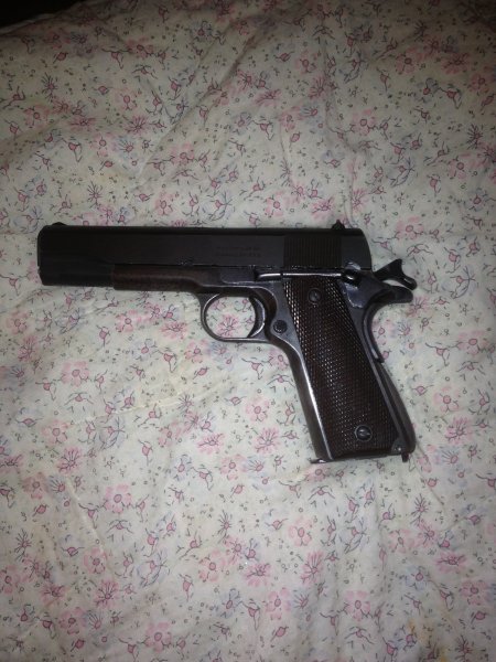 Not original finish, Prob some type of parkerize to cover the rust that can be seen out on the barrel. Last paragraph reads that this .45 Hand Ejector Model of 1917, ser #96xxx was shipped Aug 9, 1918 with a blued finish and smooth walnut grips. Thanks for looking!