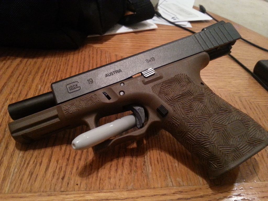Item Description: Glock 19 FDE, stippled, undercut guard and mag well work, trigger work by Firing line...
