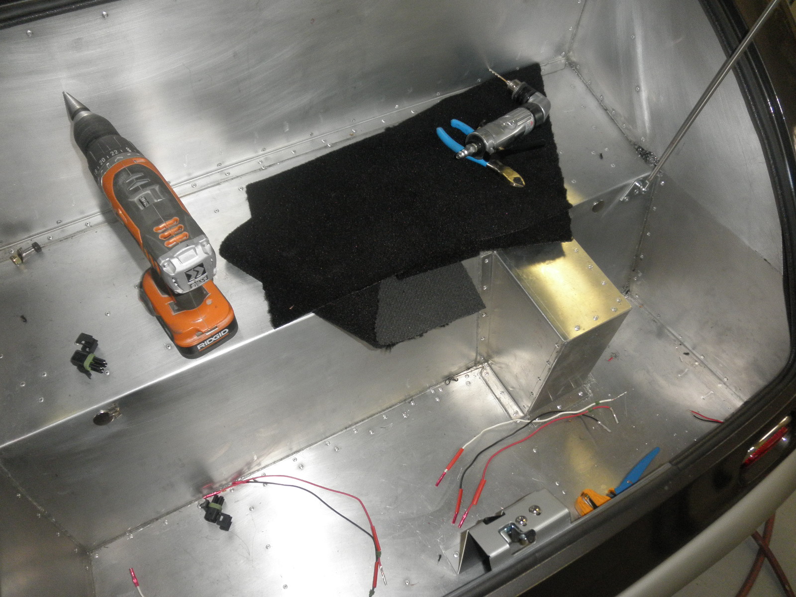 Final mounted all the trunk aluminum, a very minute shift in the body mount will make some rivet holes not align properly especially the sides after the bulb seal is installed. Took damn near a day to get everything aligned again. I had planned on using the insulating material shown in the cockpit but changed my mind so I put it to good use in the trunk. The piece of carpet provided for the three link cover leaves a seam showing so I took some carpet shavings and used Elmers glue (dries clear) to clean up the seams. Overall I like it and no more tinny/echo sounds in the trunk. One tool that has come in handy is a gasket hole punch. Mine is a Mac with a bunch of hole sizes. I use it to punch nice clean holes in the insulation and carpet.
