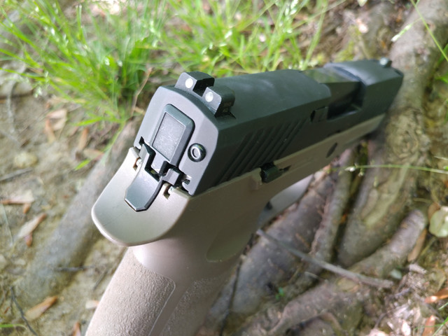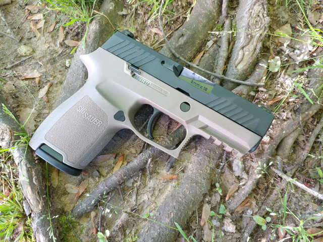 Item Description: This is a unique custom P320. It has a modified FDE frame similar in size as the X-Compact. Shortened to accomodate the 3.6" barrel. It comes equipped with night sights, and two 15rd magazines.
